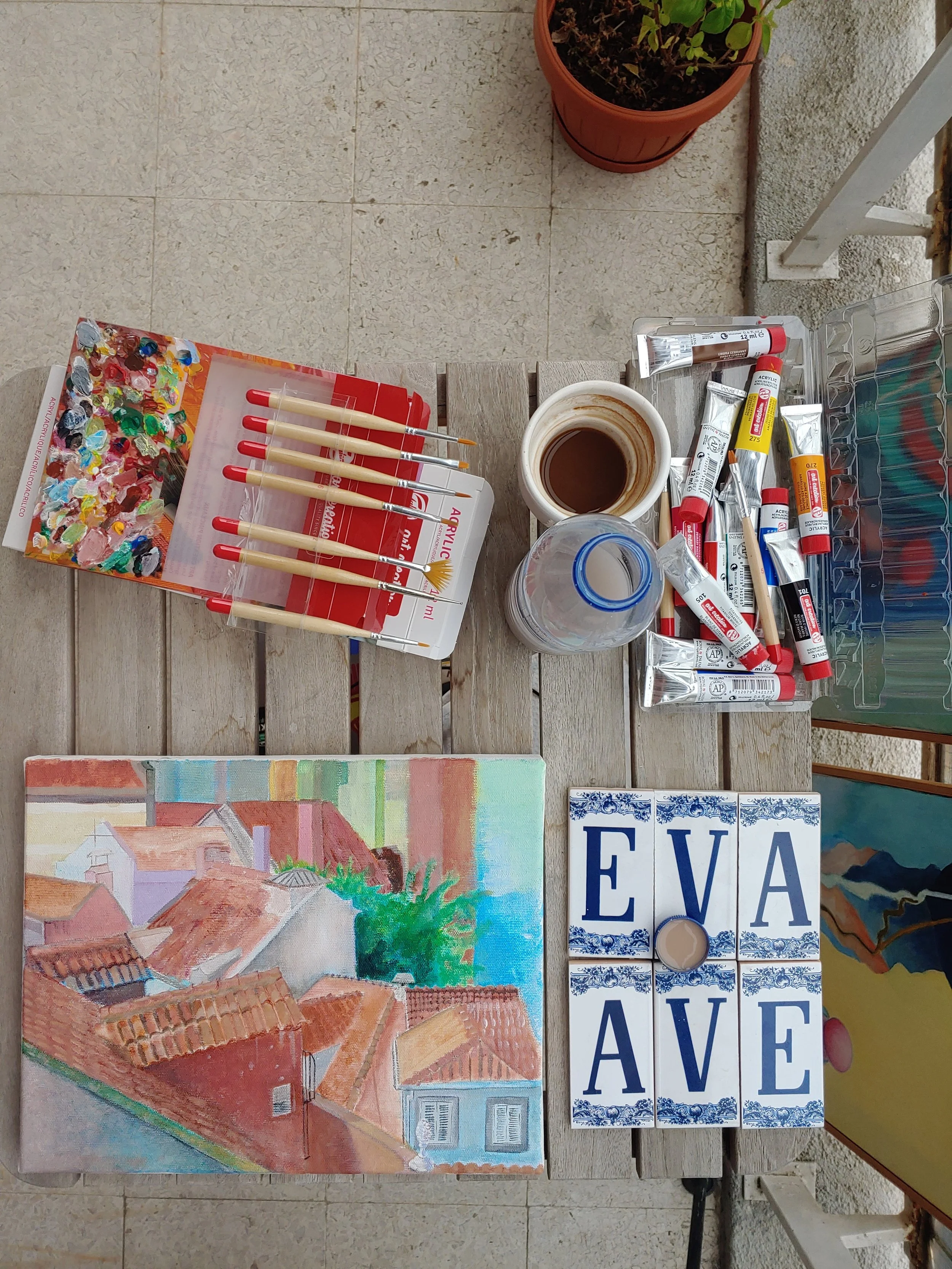 Aqui em 2022 pinto os telhados perto do apartamento da minha irmã no Rato em Lisboa. Não cheguei com qualquer material de arte, por isso fui a uma loja de artigos de arte comprar tinta, pincéis e uma tela. As pinturas do meu pai estão encostadas de lado.